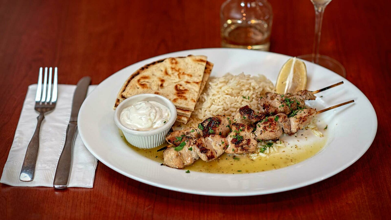 Two skewers of meat served with pita & tzatziki. Alongside Greek fries or rice